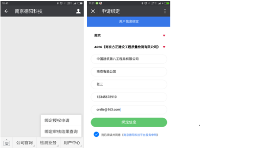 依次選擇檢測(cè)中心所屬地區(qū)、檢測(cè)中心。然后輸入委托單位名稱、工程名稱、輸入聯(lián)系人、輸入手機(jī)號(hào)、輸入郵箱信息然后點(diǎn)擊綁定信息。(信息可以簡(jiǎn)寫(xiě),但不能缺項(xiàng),然后通知我公司進(jìn)行綁定025-83401276。)